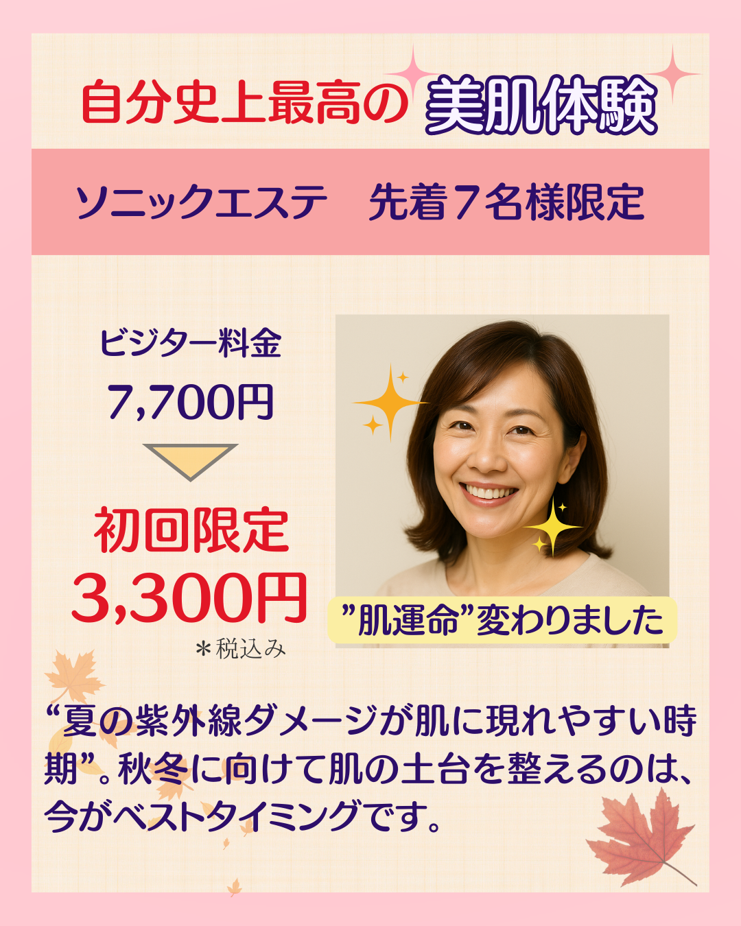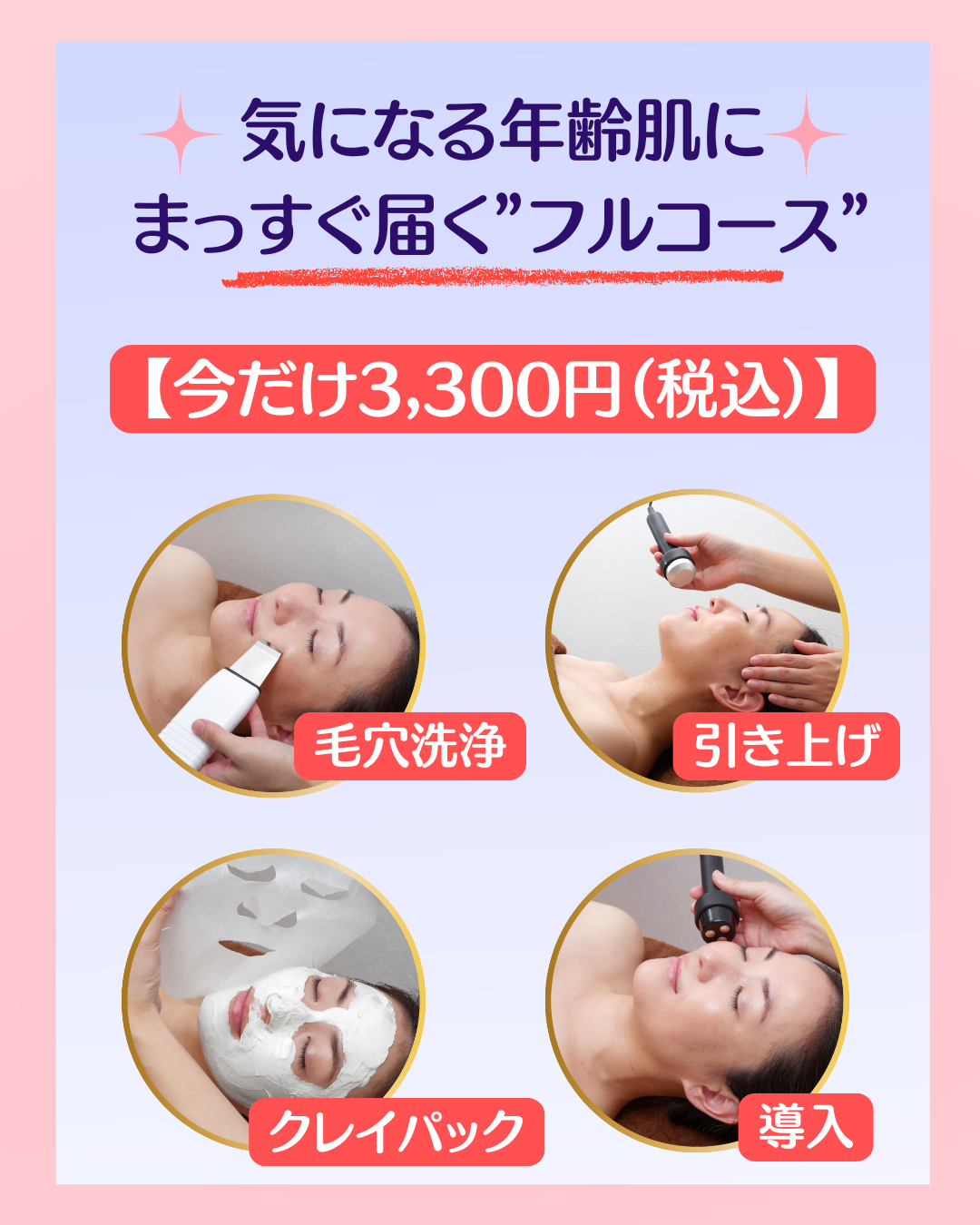 → はじめに専用化粧品(12回分/24,200円)をご購入いただくと、その後の施術は1回2,750円の都度払い。無理なく続けられる価格設計です。